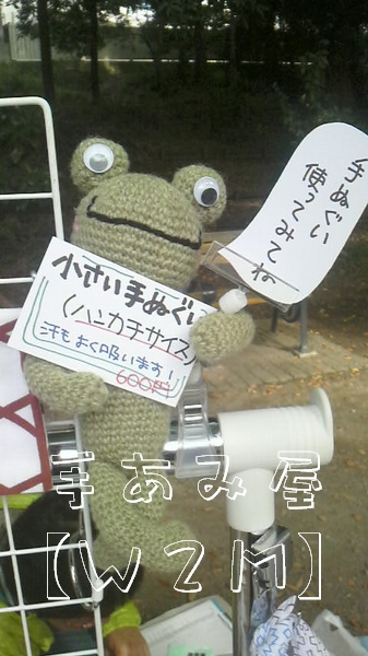カエルのあみぐるみにカエル手ぬぐいのTシャツを着せ、